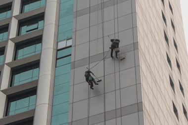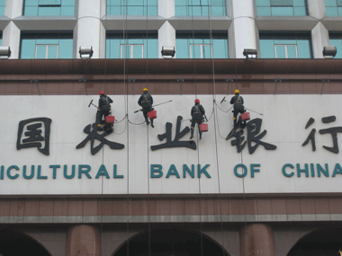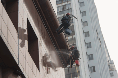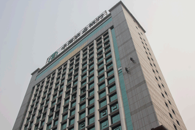 巴萊特外墻清洗工作人員正在緊張有序的對(duì)宜昌農(nóng)行外墻進(jìn)行清洗